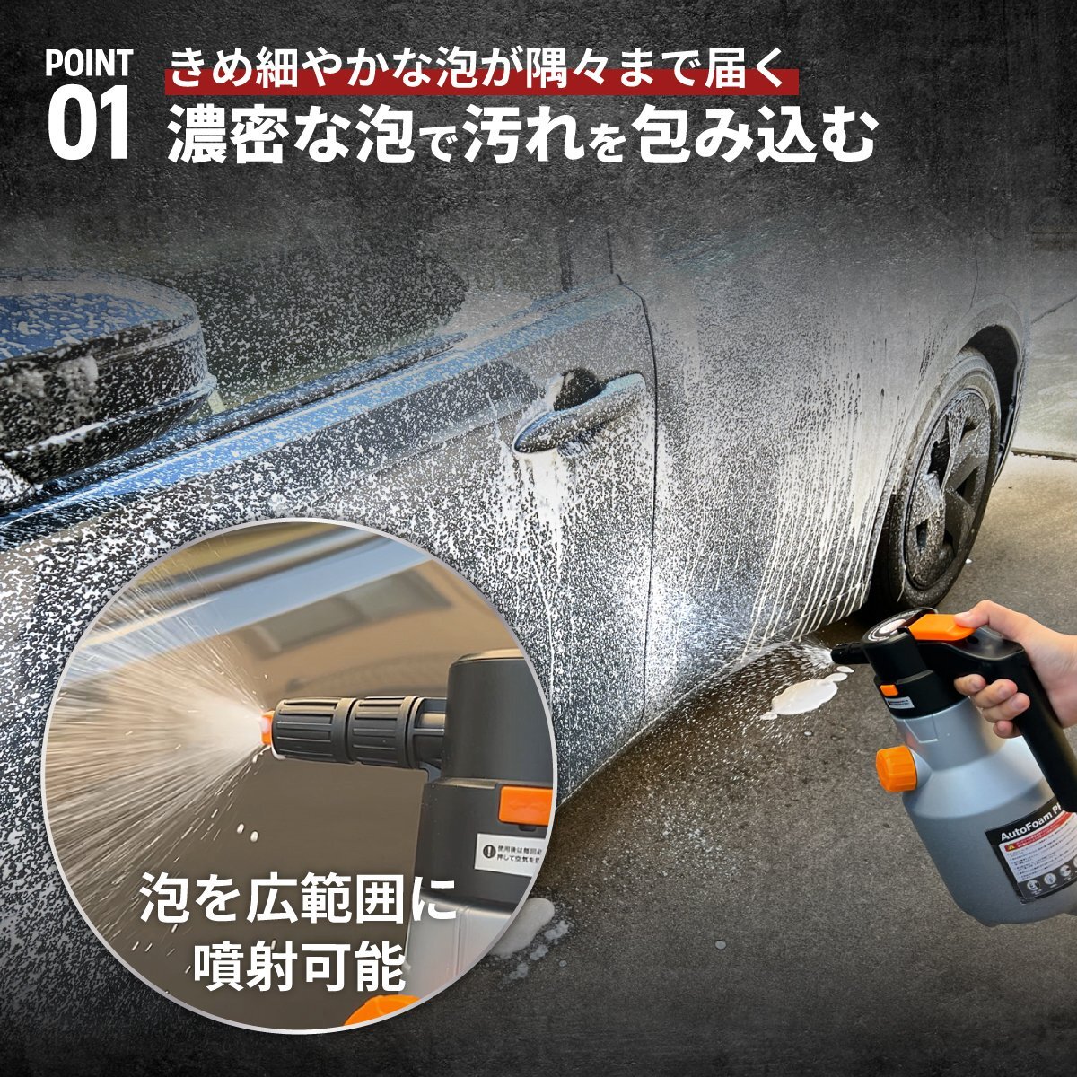 USB充電式のフォームガンとなります、きめ細かい泡を出し汚れを浮かします、1回の充電で40分前後使用可能、車1台分洗車可能です(洗剤は2〜3回補充しないといけないかも)